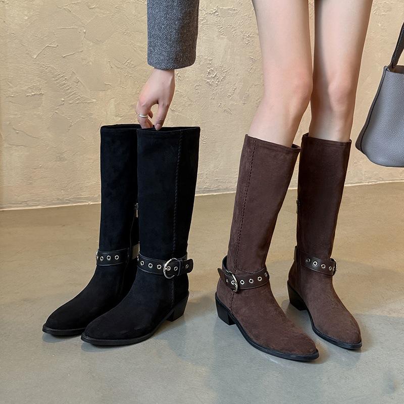 Stiefel mit grobem Absatz im Western-Stil für Damen, Herbst 2025, neu, vielseitig, mit Gürtelschnalle, grober Absatz, runde Spitze, modische Stiefel