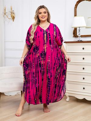 Damen Chiffon-Maxikleid mit Farbverlauf, bedruckt, V-Ausschnitt, kurzärmelig, langes Kleid, lässig, locker, Strandkleid für den Sommerurlaub