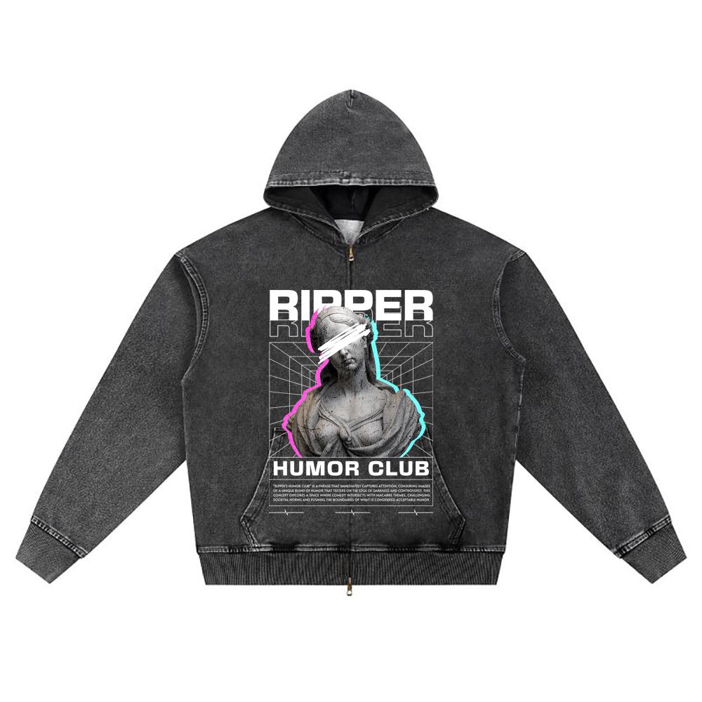 DTG print Knitted Denim Zip-Up Hoodie Ripper's Humor Club Brother Print Zipper Hoodies