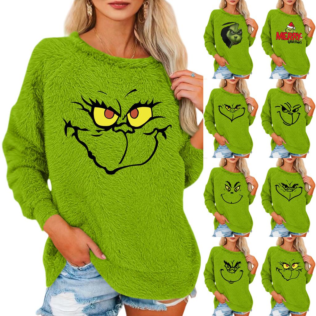 Damen Modischer Rundhals Langarm Weihnachts-Print Lockerer Plüsch Warmer Pullover
