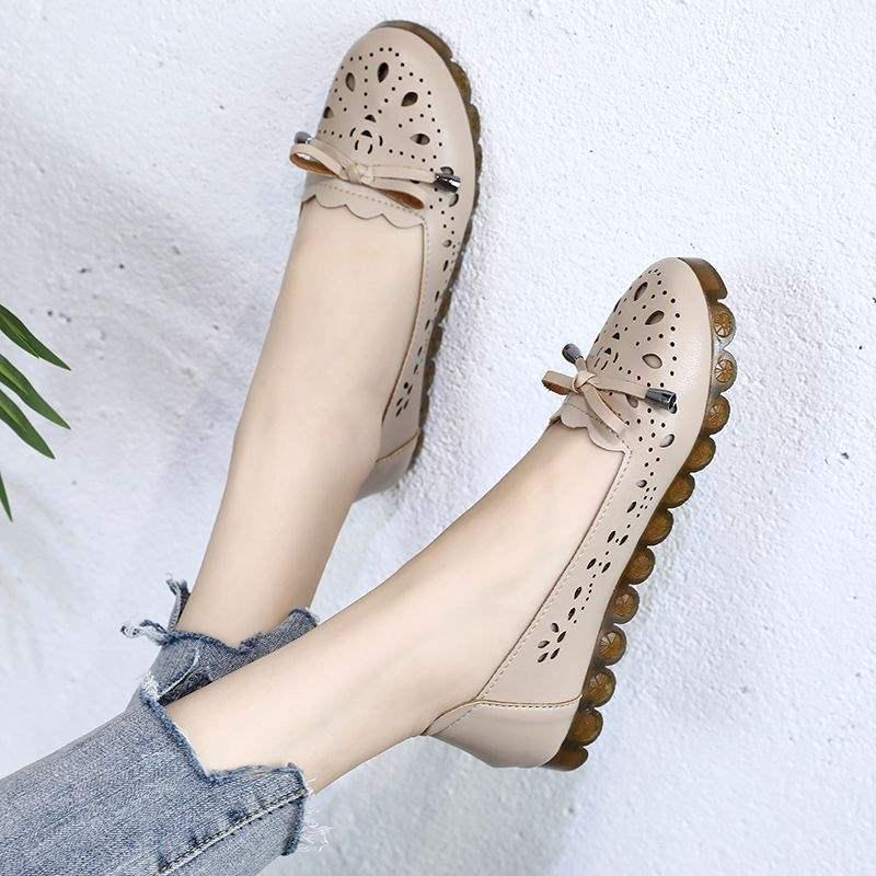 Damen Atmungsaktive Weiche Leder Slipper - Hohles Design, Rutschfest, Weiche Sohle Lässige Mama-Schuhe