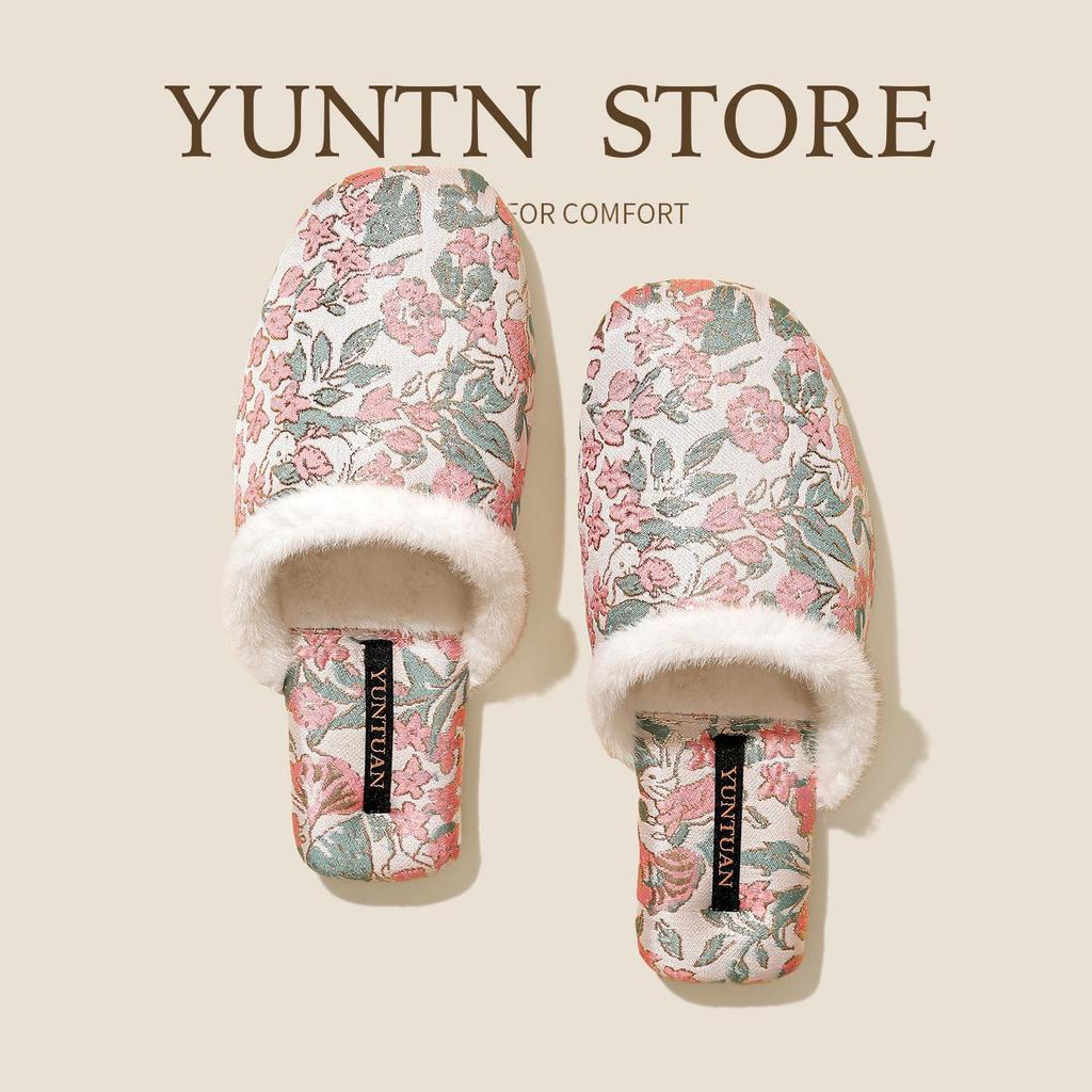 Damen Fleecegefütterte Florale Jacquard Chinesischer Stil Rutschfeste Warme Baumwollpantoffeln für Herbst und Winter
