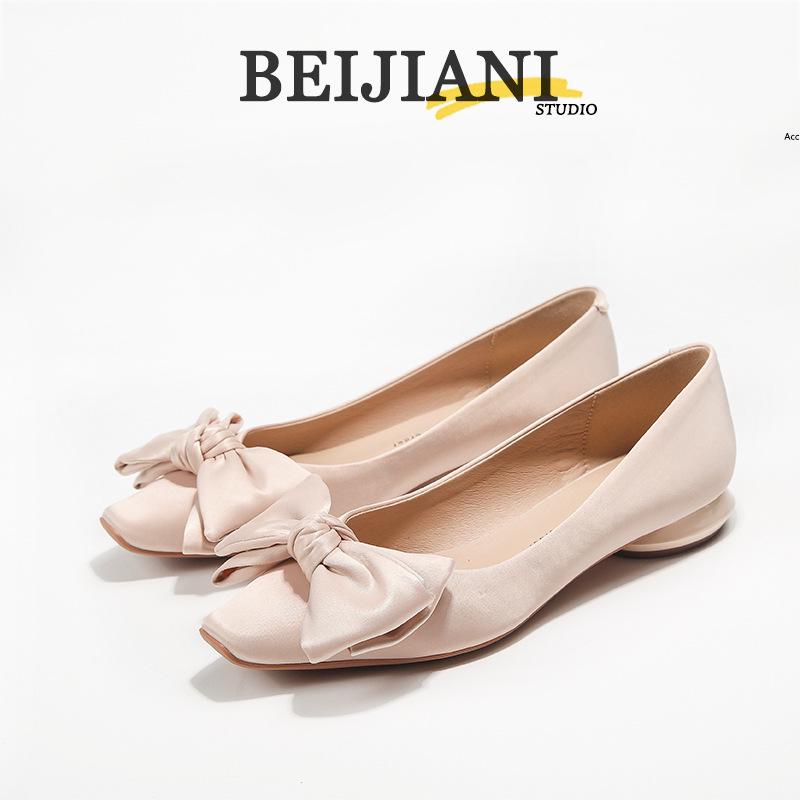BEIJIANI Satin Mary Jane Flats mit eckiger Zehenpartie und Schleife mit klobigem Absatz für Damen - Frühjahrskollektion