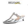 Schlüpfen Sie in Eleganz mit diesen raffinierten Mulesandalen mit geschlossener Zehenpartie.. Gefertigt aus einem Mikrofaser-Obermaterial, verfügen sie über einen stilvollen silbernen Strass-T-Riemen, der jedem Outfit einen Hauch von Raffinesse verleiht.. Die Gummisohle bietet zuverlässige Traktion und Komfort und macht sie für verschiedene Anlässe geeignet, während die Schlichtheit des Designs durch ein minimalistisches, futterloses Inneres unterstrichen wird.. Diese Sandalen sind eine perfekte Mischung aus Stil und Funktionalität und sorgen dafür, dass Sie sowohl anmutig als auch bequem gehen.