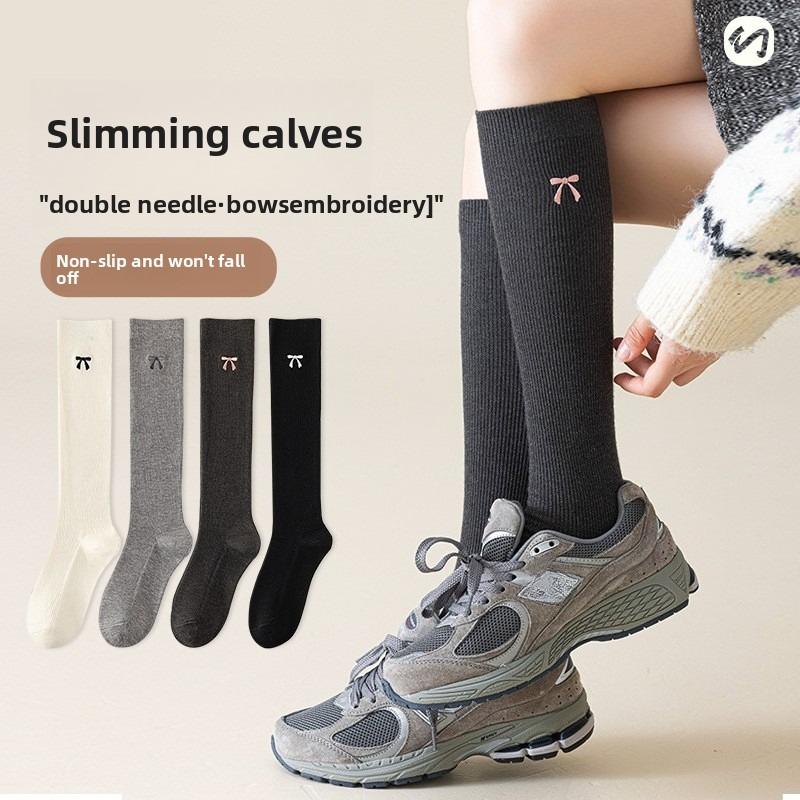 Schleifen-Kniestrümpfe für Damen, Frühlings- und Herbststil, Lange Oberschenkelhohe Strümpfe, Rutschfest, Leicht pressend, Schlankmachende Bein-Socken, Schwarze Schlankmachende Lange Socken