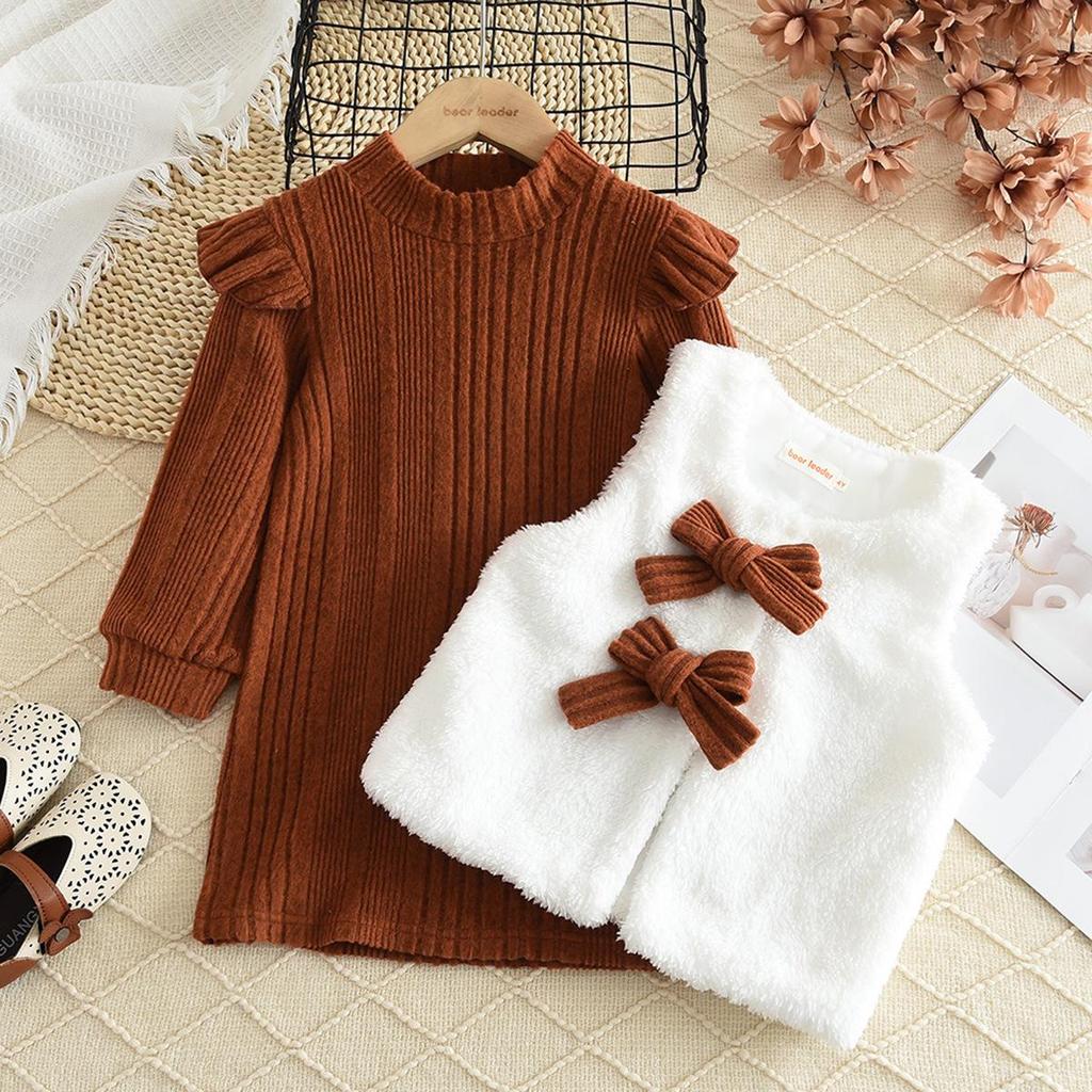 Dieses stilvolle Set für Mädchen besteht aus einem gerippten Rollkragenkleid und einer kuscheligen Plüschweste, perfekt für die Herbst- und Wintersaison 2025.. Das aus hochwertigem Polyestermaterial gefertigte Kleid bietet sowohl Komfort als auch Haltbarkeit. Das gerippte Design verleiht eine elegante Note, während die Weste zusätzliche Wärme und Stil bietet.. Dieses Set ist ideal für verschiedene Anlässe und vereint Mode mit Praktikabilität, was es zu einer vielseitigen Ergänzung für die Garderobe jedes jungen Mädchens macht.