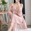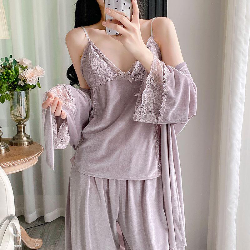 Gönnen Sie sich luxuriösen Komfort mit diesem eleganten dreiteiligen Pyjama-Set, perfekt zum Entspannen im Frühling und Sommer.. Das Set besteht aus einem spitzenbesetzten Camisole, einer langen Hose und einem passenden Morgenmantel, alle gefertigt aus seidigem Polyester für ein weiches und leichtes Tragegefühl.. Der Morgenmantel, veredelt mit einem Hauch von goldenem Samtfinish, fügt einen Hauch von Opulenz hinzu, während die langen Ärmel genau die richtige Menge an Bedeckung für kühlere Abende bieten.. Dieses Set vereint Raffinesse mit sinnlichem Reiz und macht es zu einer unverzichtbaren Ergänzung für jede Homewear-Kollektion.
