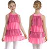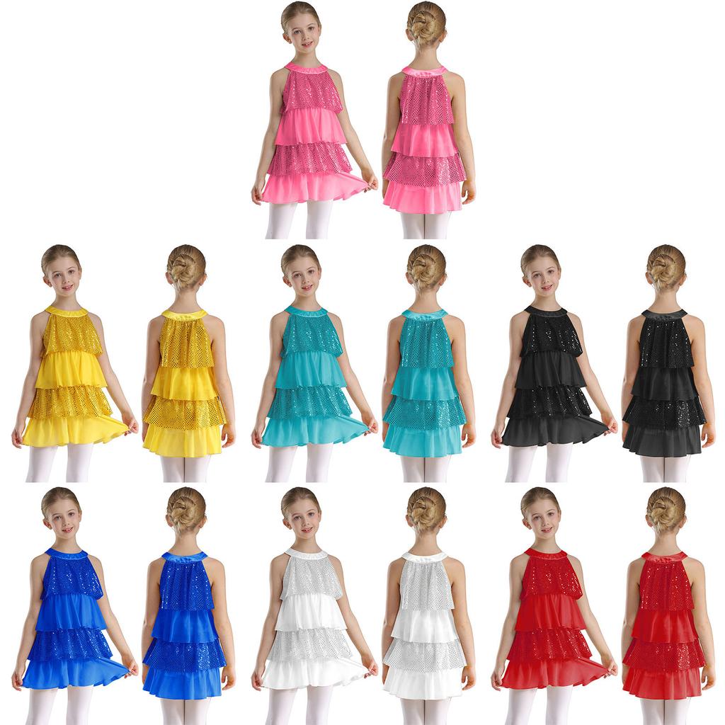 Gestuftes Rüschen-Mädchen-Tanzkleid Glänzende Pailletten Patchwork A-Linie Ärmellos Aufführungskostüm