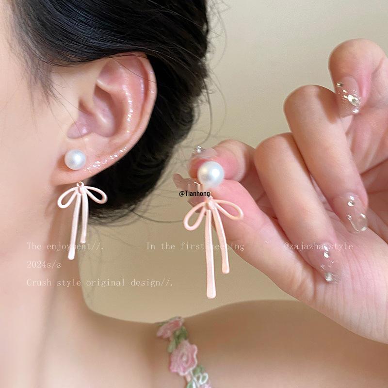 Damen Rosa Schleife Perlenstecker - 2025 Sommer Nischendesign