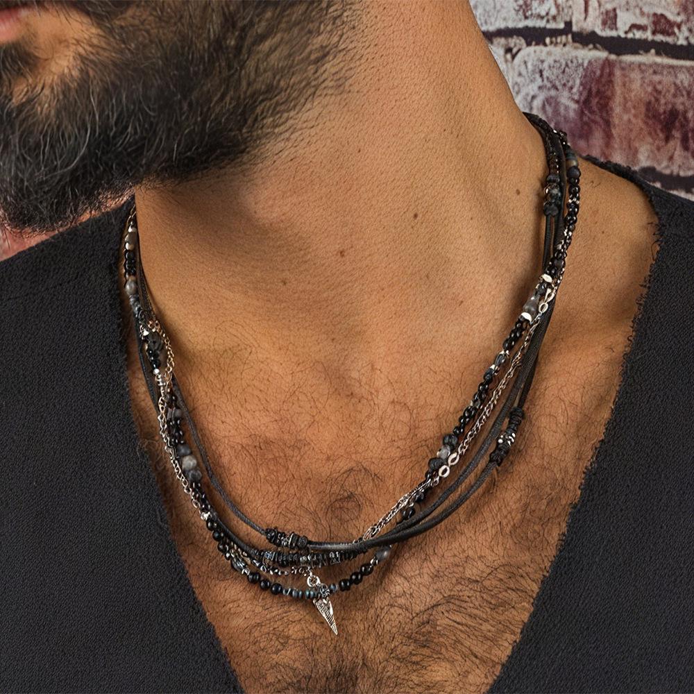 Retro Herren Mehrschichtige Lederkette mit Schwarzem Achat Dreiecksanhänger