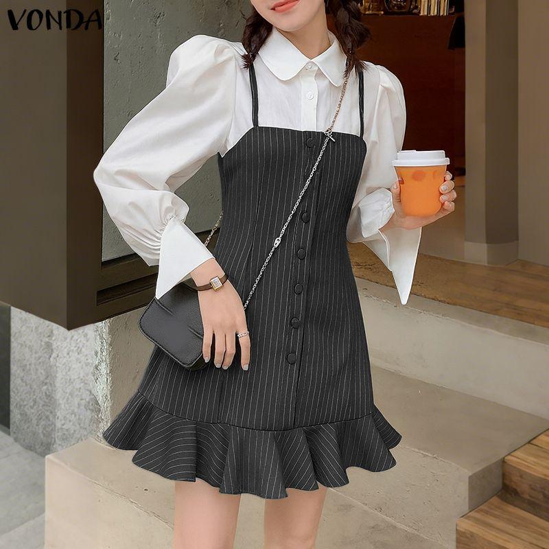 Features: A two piece faux dress with a striped collar and contrasting colors, featuring pleated bubbles and a lotus leaf hem with buttons that can be opened. It is a dignified and playful woven long sleeved dress