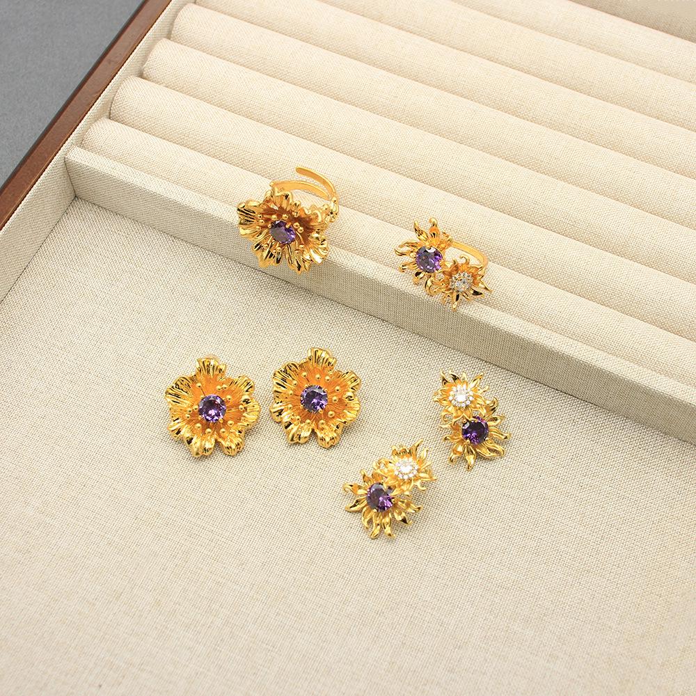 Nischen Französische Retro Gänseblümchen Ohrstecker & Ring Set mit Lila Zirkon