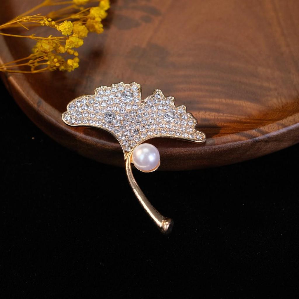 Ginkgo Leaf Pearl Rhinestone Brooch Scarf Pin