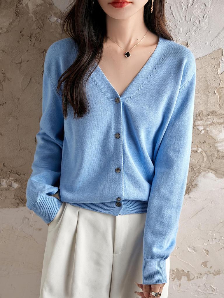 Entdecken Sie die perfekte Mischung aus Komfort und Stil mit dieser Strickjacke aus 100 % Baumwolle, entworfen für die Übergangsjahreszeiten Frühling und Herbst.. Mit einer lockeren Passform und einem V-Ausschnitt bietet dieser einfarbige Cardigan einen schicken und vielseitigen Look. Seine langen Ärmel und das hochdichte Gewebe bieten Sonnenschutz, während das atmungsaktive, dünne Material dafür sorgt, dass Sie den ganzen Tag über bequem bleiben.. Dieser Cardigan ist ideal zum Layern und ein Must-Have für jede Garderobe.