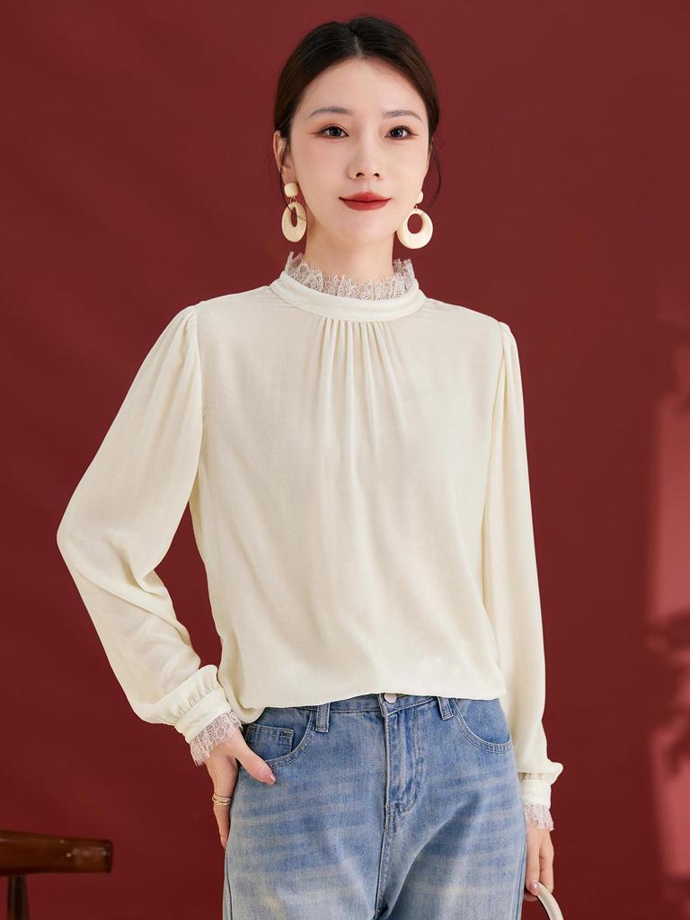 Erleben Sie die Eleganz der Herbstmode mit diesem luxuriösen Pullover, gefertigt aus einer reichhaltigen Mischung aus Seidensamt.. Sein exquisites, solides Muster ergänzt die langen Ärmel und den raffinierten Stehkragen und spiegelt einen zeitlosen französischen Stil wider.. Die plissierten Spitzendetails verleihen einen raffinierten Touch und machen es zu einer perfekten Wahl für jeden Anlass, der mühelose Schick und einen Hauch von Opulenz erfordert.