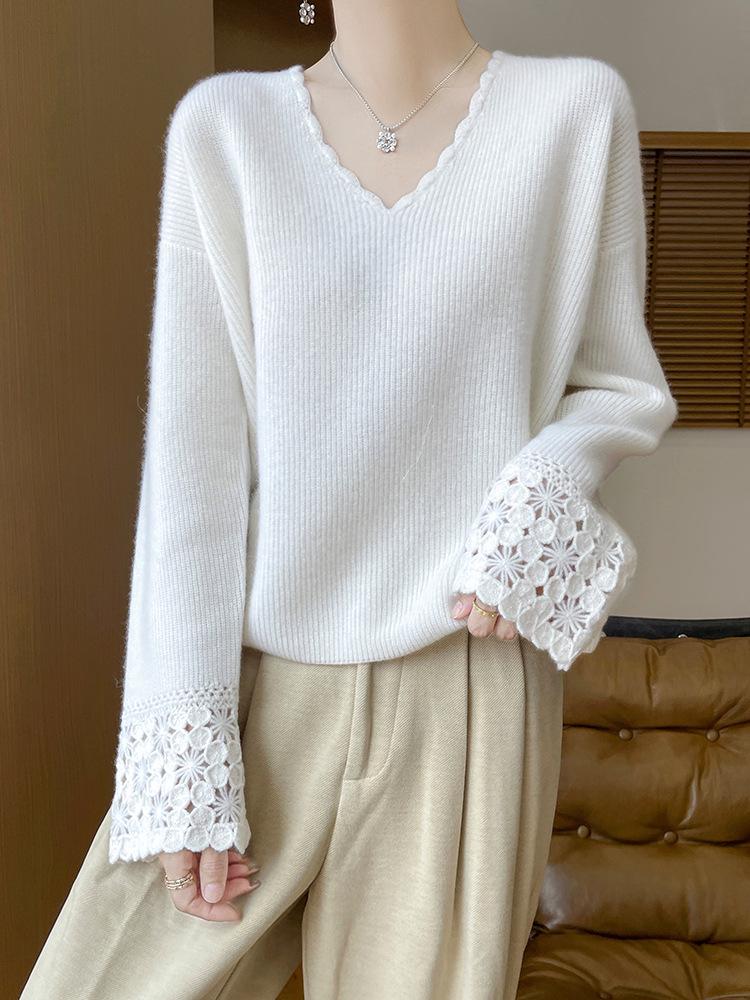 Women's 100% Pure Wool V-Neck Lace Long Sleeve Loose Sweater - Autumn/Winter 2025 Collection