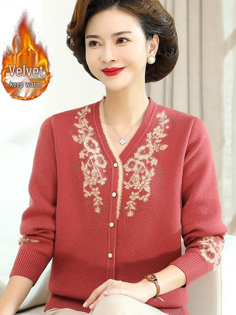 Stilvoller Winter-Samtcardigan mit V-Ausschnitt für Mütter – Modischer Pullover für Frauen mittleren und höheren Alters