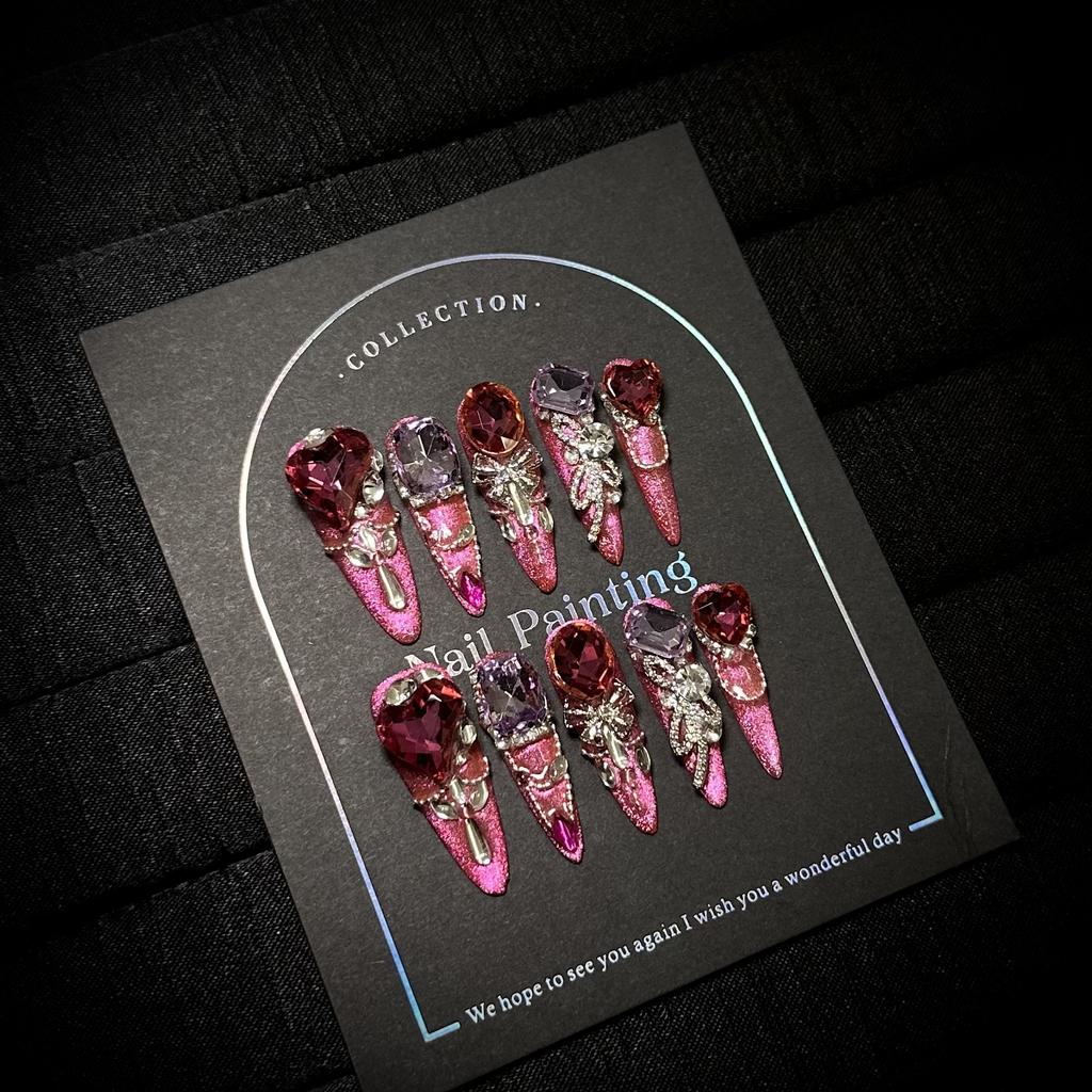 Handmade Luxury Press on Nails Long Almond French Tip Sparkly Fake Nails 3D Rhinestones Designs Acrylic Nails Reusable Stick on Nail for Women