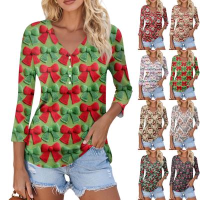 Damenmode Lässiges T-Shirt mit Knopfleiste, V-Ausschnitt, sieben Ärmeln, Weihnachtsdruck