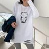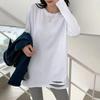 Dieses Damen-Baumwoll-T-Shirt mit langen Ärmeln in Übergröße und im angesagten Ripped-Look ist eine stilvolle und vielseitige Ergänzung für Ihre Garderobe und perfekt für Frühling und Herbst.. Hergestellt aus hochwertigem Baumwollstoff, bietet es eine bequeme und atmungsaktive Passform, ideal für den täglichen Gebrauch.. Das T-Shirt hat lange Ärmel mit trendigen Rissen und einen klassischen Rundhalsausschnitt, was Ihrem Look eine zeitgenössische Note verleiht.. Sein mittellanges Design sorgt für eine schmeichelhafte Passform, während die dezente Buchstabenverzierung eine einzigartige Note verleiht.. Perfekt zum Kombinieren mit Jeans oder Leggings, ist dieses weiße T-Shirt ein Must-Have für jede modebewusste Frau, die Komfort und Stil sucht.