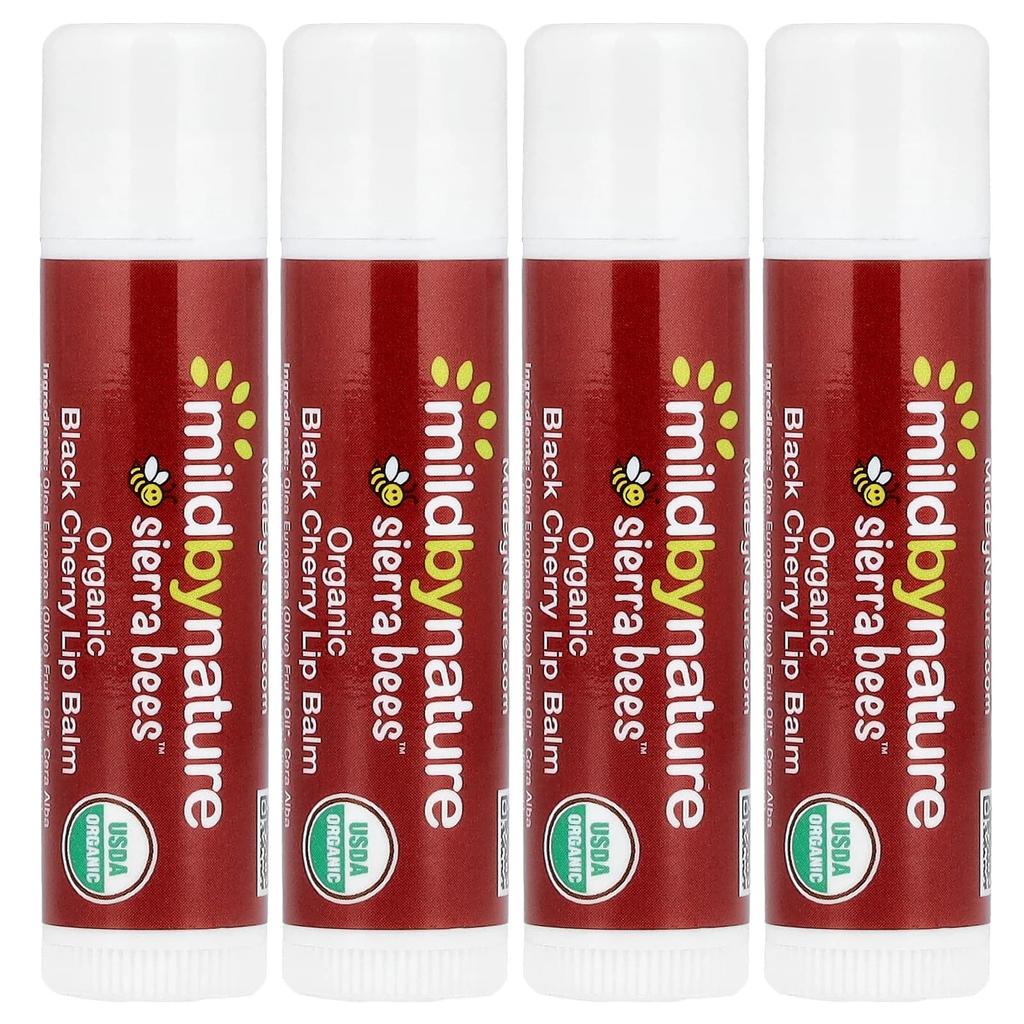 Product Description: Mild By Nature, Sierra Bees Organic Black Cherry Lip BalmContains eco-friendly ingredients: Beeswax, Olive Oil, Sunflower Oil, Vitamin EProduct Description: USDA Certified Organic, Non-GMO, Cruelty-Free, Made with eco-friendly and biodegradable ingredientsNo sulfates, preservatives, artificial fragrances and NO animal testingCertified Organic by Oregon TilthGood for lips! We are excited to announce that Sierra Bees has joined the Mild By Nature family. The new brand will also introduce effective personal care products with eco-friendly, nature-inspired formulas. Mild By Nature, Sierra Bees Organic Black Cherry Lip Balm contains beeswax, olive oil, sunflower oil, and vitamin E from sustainable sources. Our sustainably produced, USDA Organic certified beeswax meets our rigorous social, environmental, and economic requirements and is sourced from trusted beekeepers. We purchase USDA Organic beeswax from beekeepers with decades of practical experience, spanning three to four generations. These beekeepers make their living by ethically and humanely harvesting crude wax and honey. These beekeepers pride themselves on providing consistently high-quality products year after year without harming bees or other wildlife. Our organic beeswax is harvested from apiaries managed by dedicated beekeepers or in the wild. Our beekeepers continually monitor their hives to ensure the bees are well-fed and healthy throughout the year, especially during droughts and winter. Many beekeepers use wooden hives suspended from trees, preventing wildlife from disturbing them. Additionally, many of our beekeepers consistently contribute to government and university-funded research. This important research explores ways to better care for bees and keep them safe in their natural habitat. Organic beeswax is a sustainable natural product derived from Mother Nature. We are committed to protecting and preserving our bees so they can continue to pollinate and produce high-quality organic beeswax for generations to come. Enjoy the deliciousness of Mild By Nature, Sierra Bees organic lip balms all at once. 8-flavor variety pack - Mint Burst - Pomegranate - Crème Brûlée - Honey - Cocoa Butter - Tangerine Chamomile - Grapefruit - Coconut - 4-flavor variety pack