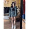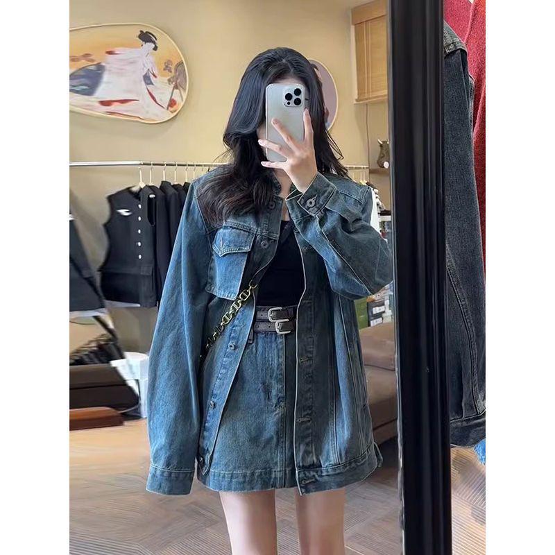 Schickes Herbst-Denimjacken- und High-Waist-Midiröck-Set für Damen