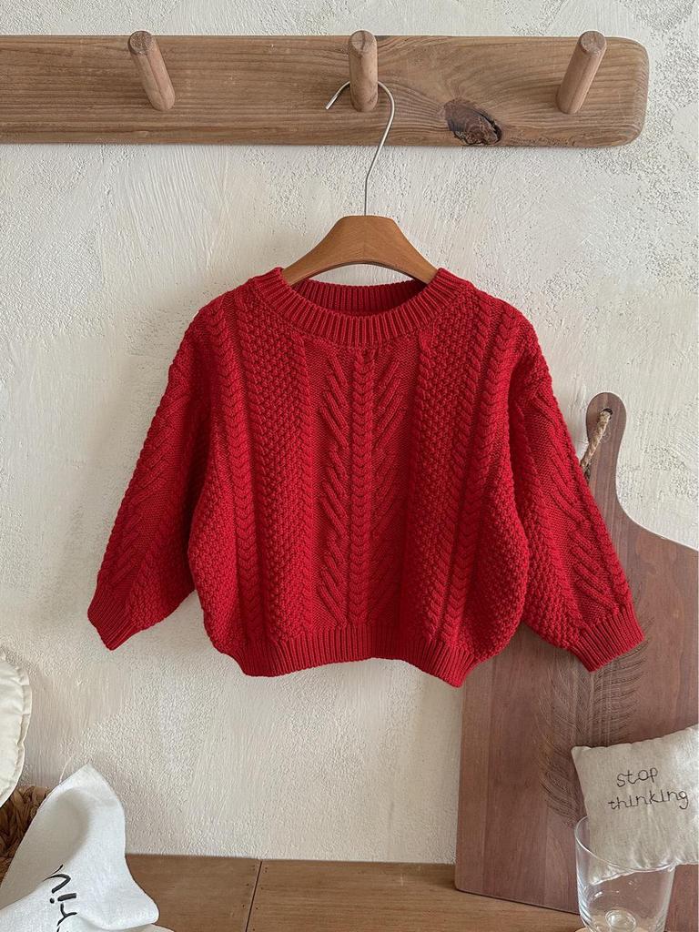 Kinder Roter Retro Zopfstrickpullover - Jungen & Mädchen Lockerer Rundhals-Pullover für Herbst/Winter, Weihnachten & Neujahr