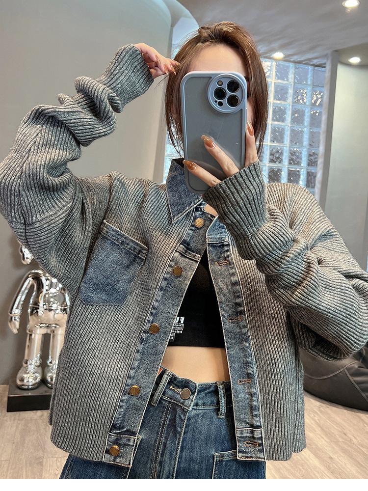2025 Europäischer Retro Denim Patchwork Strick-Cardigan: Damen Locker Geschnittene Kurze Jacke