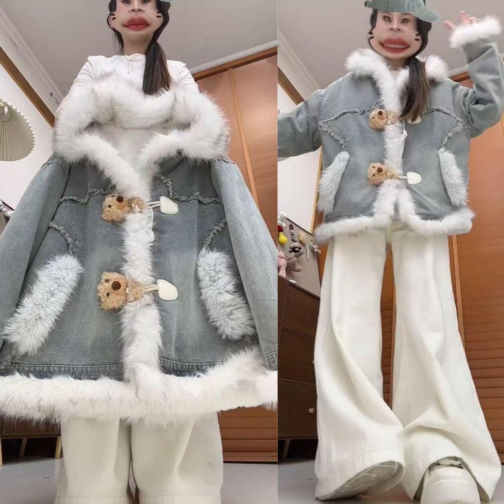 Damen Fuzzy Retro Denimjacke - Winter 2025 Street Style, Kurz & Verdickt mit Baumwollpolsterung.