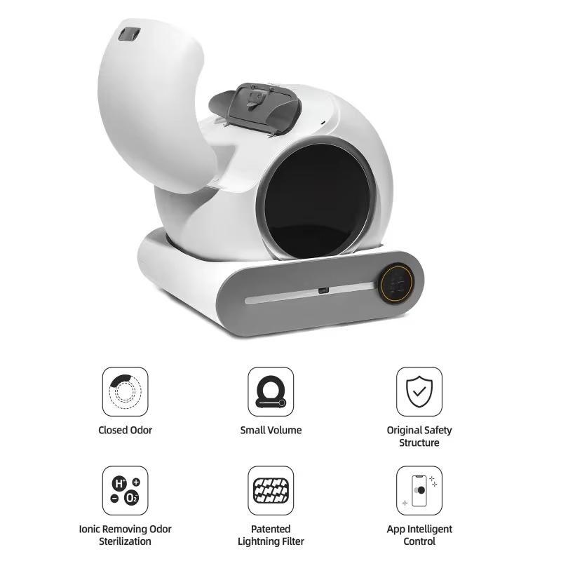 Die selbstreinigende Katzentoilette mit innovativer Desodorierungstechnologie verfügt über innovative Elektronik. Der ionische Desodorierer ist sicher und ungiftig und erfordert keinen Austausch von Verbrauchsmaterialien. Der ionische Desodorierer beginnt zu wirken, nachdem Ihre Katze mit dem Kacken fertig ist, und reduziert die Geruchsemissionen in den Raum.