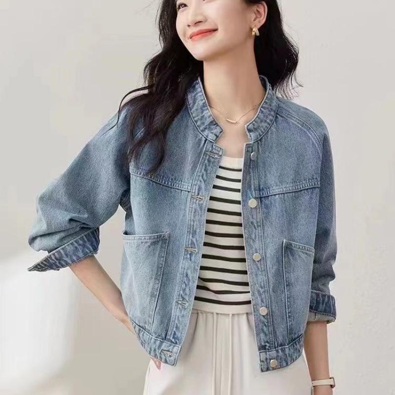 Women's Retro Washed Denim Jacket 2025 - Stand-Up Collar, Petite Long Sleeve, Autumn/Winter Top