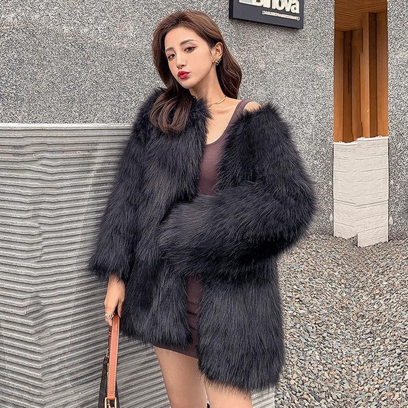 Damen-Kunstpelzmantel, mittel und lang, Winter, Kunstfuchsfell, schmal und dünn, verdickter Pelzmantel