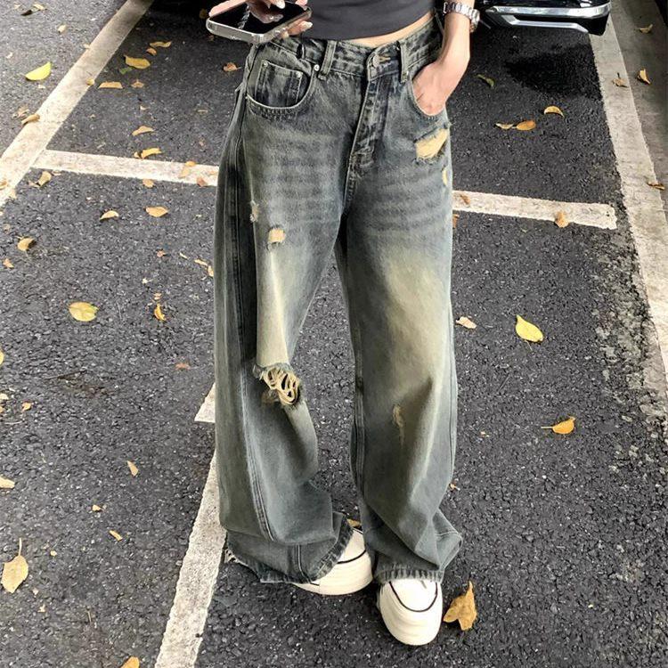 Damen Amerikanische Retro High Waist Petite Wide Leg Ripped Jeans