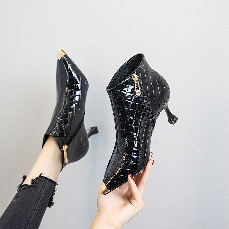 European and American thin heel boots pointed thin boots 2025 autumn and winter new patent leather short boots women's high heels versatile vel