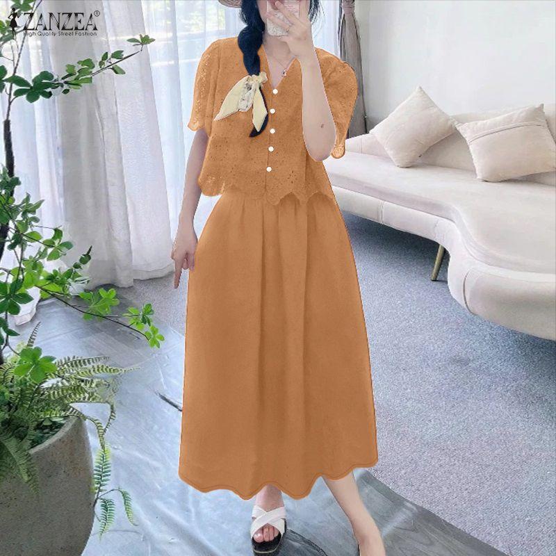 ZANZEA Women Short Sleeve Crochet Blouse and Long Skirts Summer Two Piece Sets