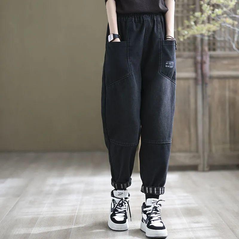 Damen High Waist Elastische Jeans: 2024 Herbst/Winter Retro Bestickte Harem Cropped Hose