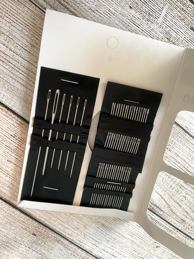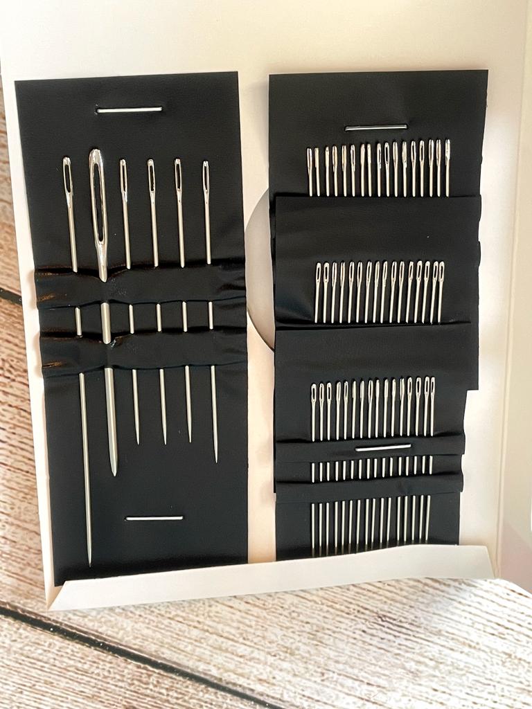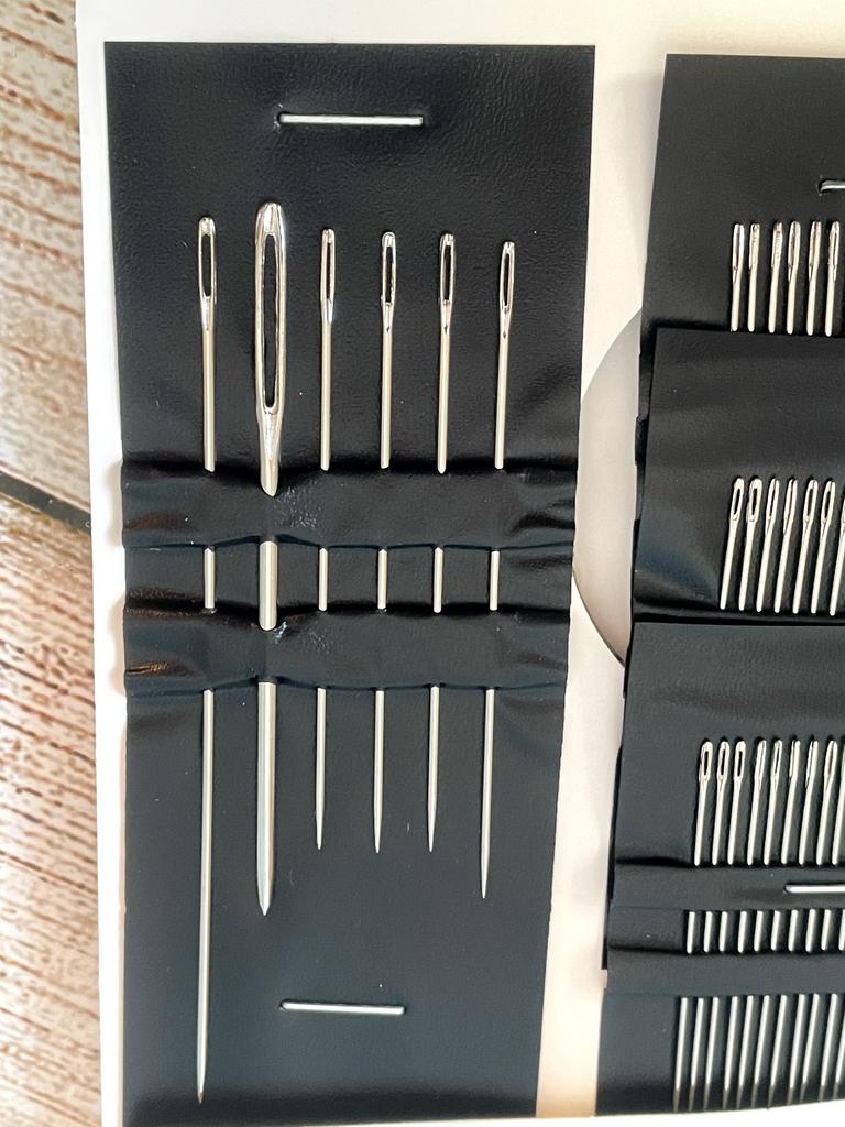Das Paket enthält mehrere Nadeln mit unterschiedlichen Längen und Öhrdicken. Dies ermöglicht die Verarbeitung verschiedener Arten von Garnen und Stoffen, von feiner Seide bis hin zu dickerer Wolle oder Stickgarn.. Organisation: Die Nadeln werden in einem praktischen schwarzen Halter aufbewahrt, der sie ordentlich und geschützt hält und die Auswahl des geeigneten Werkzeugs für jede Aufgabe erleichtert.