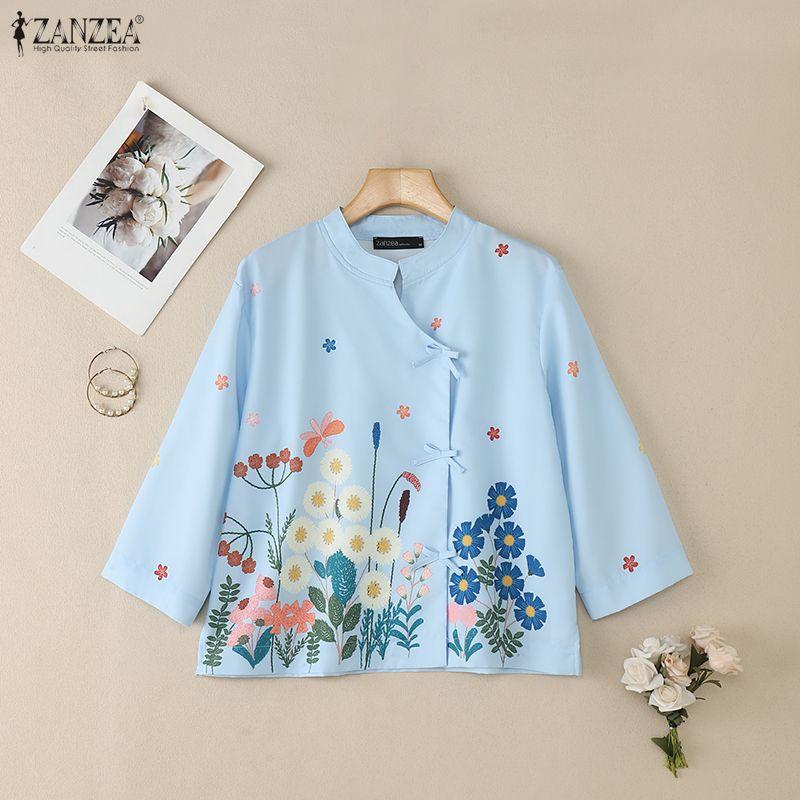 ZANZEA Women Summer Round Neck Long Sleeve Loose Floral Blouse