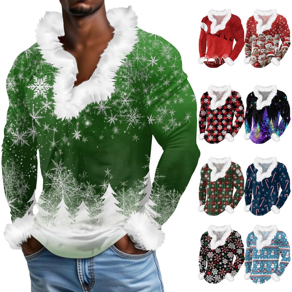 Herren Lässiges Weihnachten Bedrucktes Plüsch V-Ausschnitt und Fleece Langarm-Sweatshirt