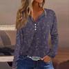Damen T-Shirt mit V-Ausschnitt, lässig, Blumendruck, langärmelig, zum Zuknöpfen, langärmelig