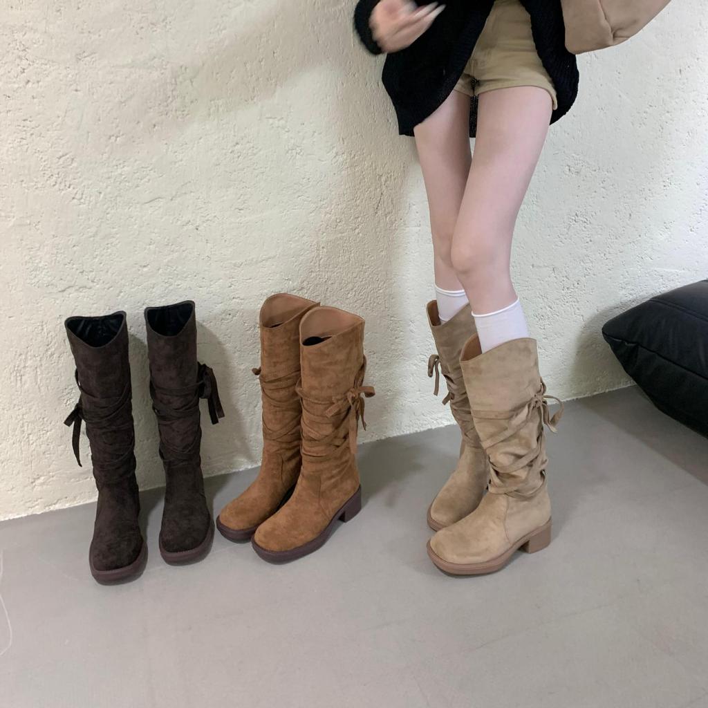 Herbst 2025 Retro Ödland Fransen Ritterstiefel Dicker Absatz aber knielange Stiefel Schlanker Schaft Mittelhohe Stiefel Damen