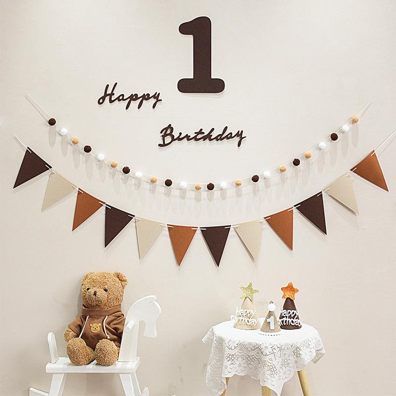 Retro Kaffeebraune Filz-Geburtstagsdekoration: Buchstaben, Zahlen, Pompons, Wimpelketten für die Kulisse zum ersten Geburtstag.