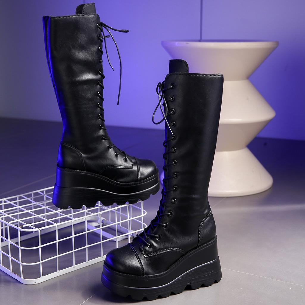 Stiefel Damen Plateau Schuhe Punk Goth Lolita High Heels Winter Regen Kampf Militär Keil Leder Schwarz New Rock Sonderangebote