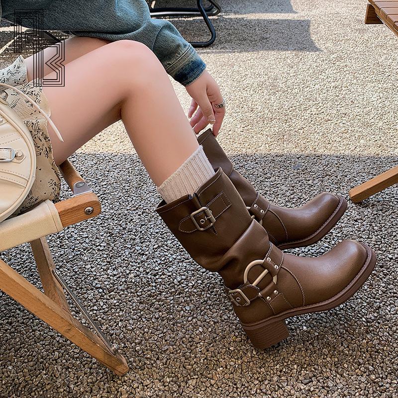 Y2k Western Gürtelschnalle Stiefel mit Blockabsatz, Mittellange Stiefel für Damen, Modische einfarbige Stiefel