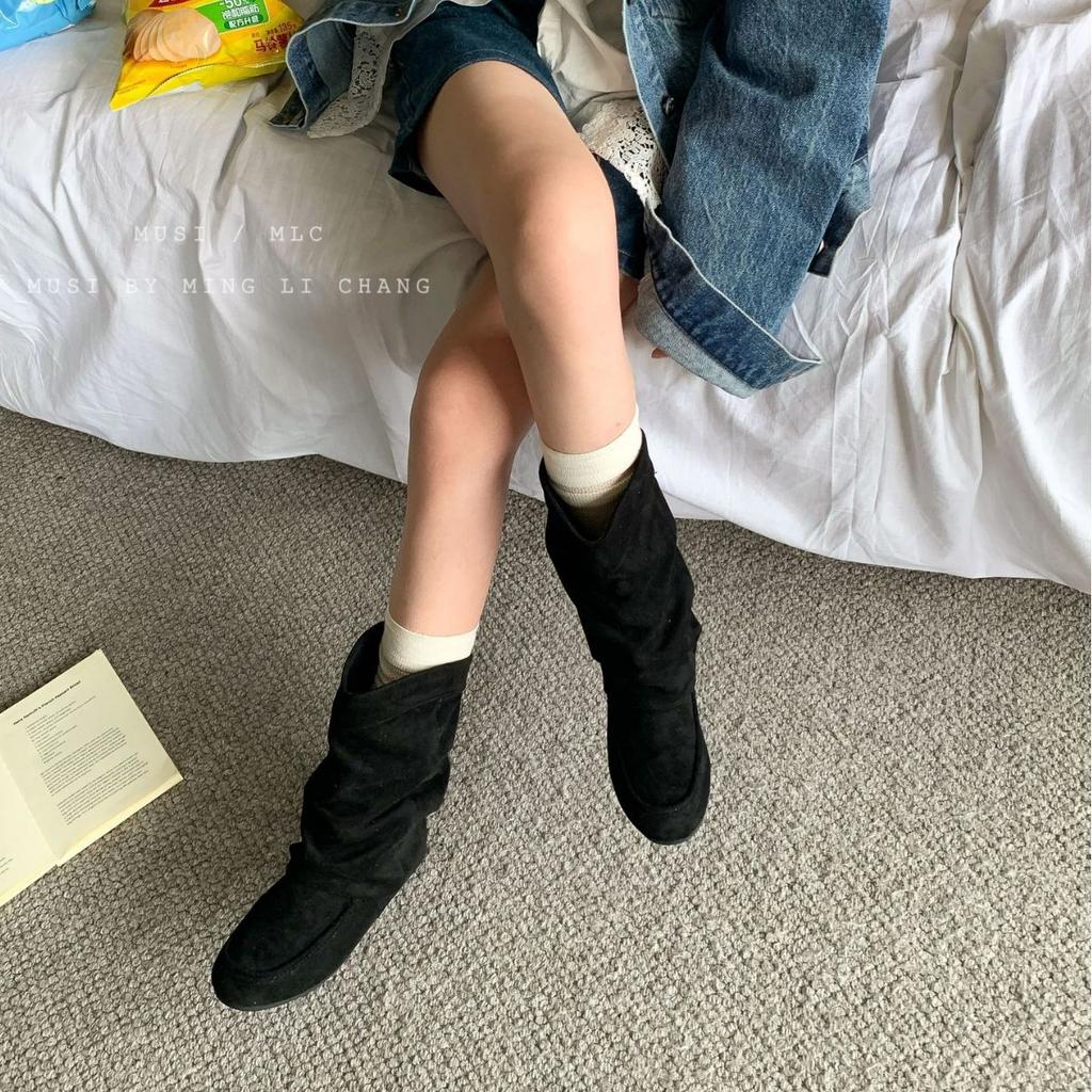 2025 Frühling und Herbst Damen Wildleder Runde Spitze Flacher Boden Temperament Innere Höhenerhöhung 3CM Ein Pedal Stiefel Rauchrohrstiefel