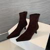 Neue sexy kurze Stiefeletten mit spitzem Absatz für Damen, Herbst/Winter 2025, aus schwarzem Wildleder, mit Reißverschluss hinten und elastischem Gummizug.