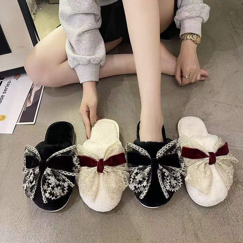 Mode Zapatos Mode Niedliche Damen Baumwollpantoffeln 2025 Winter Neu Runde Zehenpartie Flache Schuhe Schlichte Schleife Damenschuhe Zehentrenner Für Damen