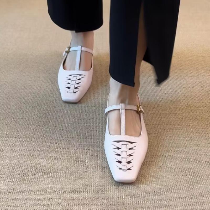 Modische Damen Ballerinas aus Kuhleder, schmaler Riemen, geflochtene T-Spange, eckige Zehenpartie, hohe Qualität, weich, bequem, elegant