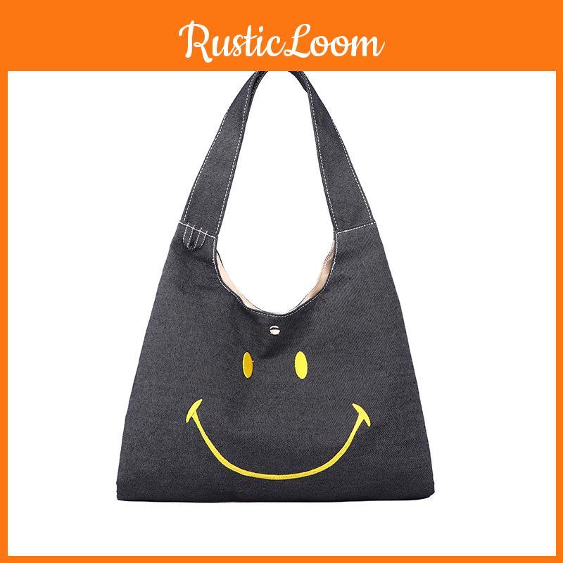 Pattern Smiling Face Shopping Canvas School Bag With Expandable Casual Style