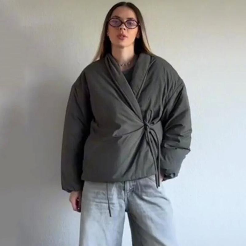 Damen Winterjacke, bequem, warm, dick, mit Schnürung, Dekoration im Kimono-Stil, langärmelig